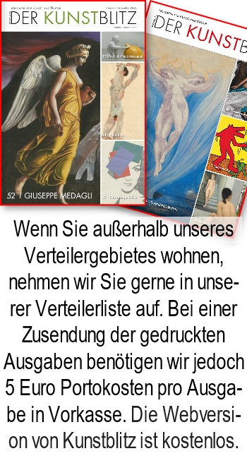 IMPRESSUM DER KUNSTBLITZ Herausgeber: Patrizio Medagli Postanschrift: DER KUNSTBLITZ Vohwinkeler Str. 154 42329 Wuppertal Tel. 0049 (0)202 738217 kunstblitz@derkunstblitz.com |